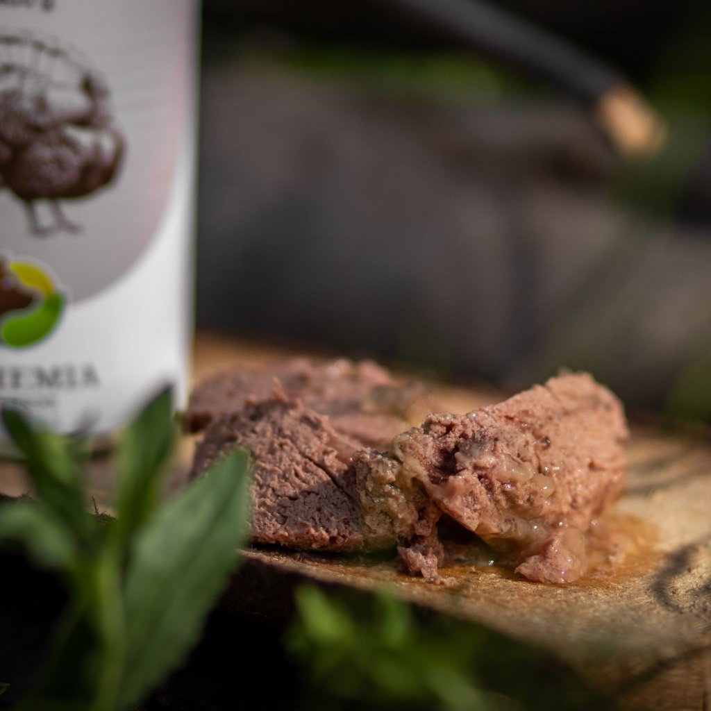 Složení: Krocaní maso 70 %, zeleninový vývar 28,8 %, lněný olej 0,2 % (za studena lisovaný)