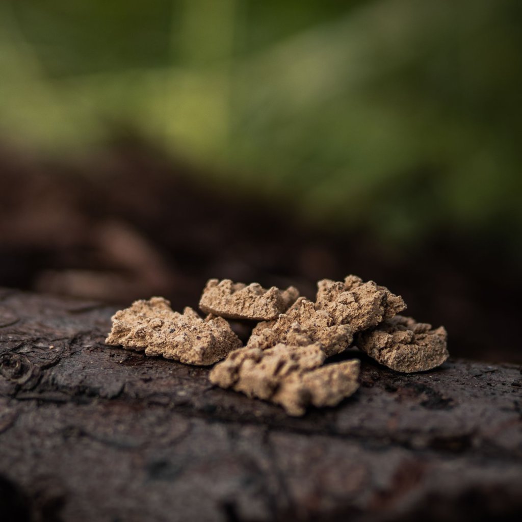 Složení: Tapioková mouka, psyllium, bramborová vláknina, sušený vaječný bílek, sušený celer kořen, inulin, lososový protein hydrolyzovaný, guarová či xantanová guma, kachní moučka, kmín, petrželka list sušený, chitosan, rozmarýnový prach, skořice