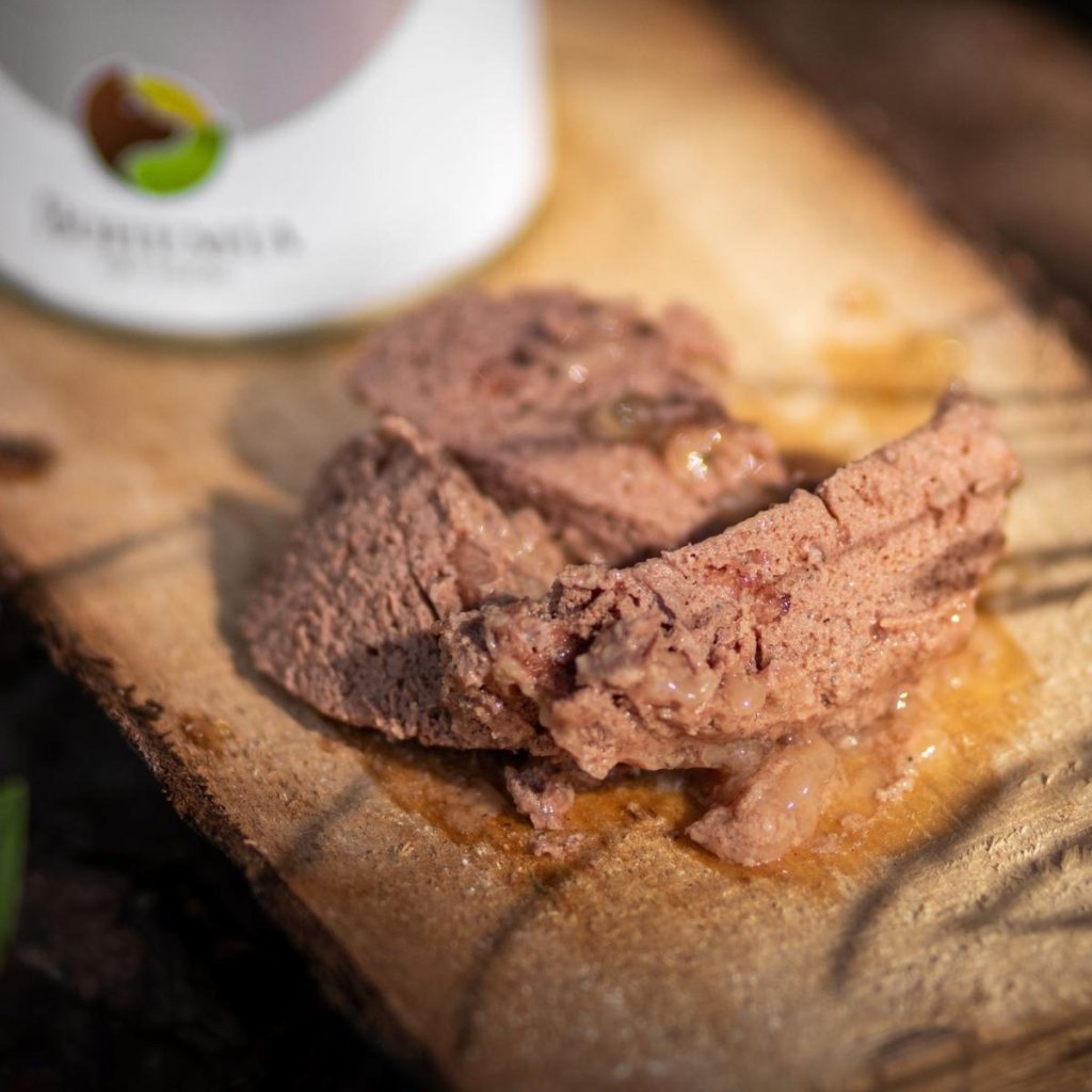 Složení: Selečí maso (z plemene Landrase) 40 %, zeleninový vývar 28,8 %, hovězí maso (z plemene Angus) 30 %, slunečnicový olej 0,2 % (zastudena lisovaný)