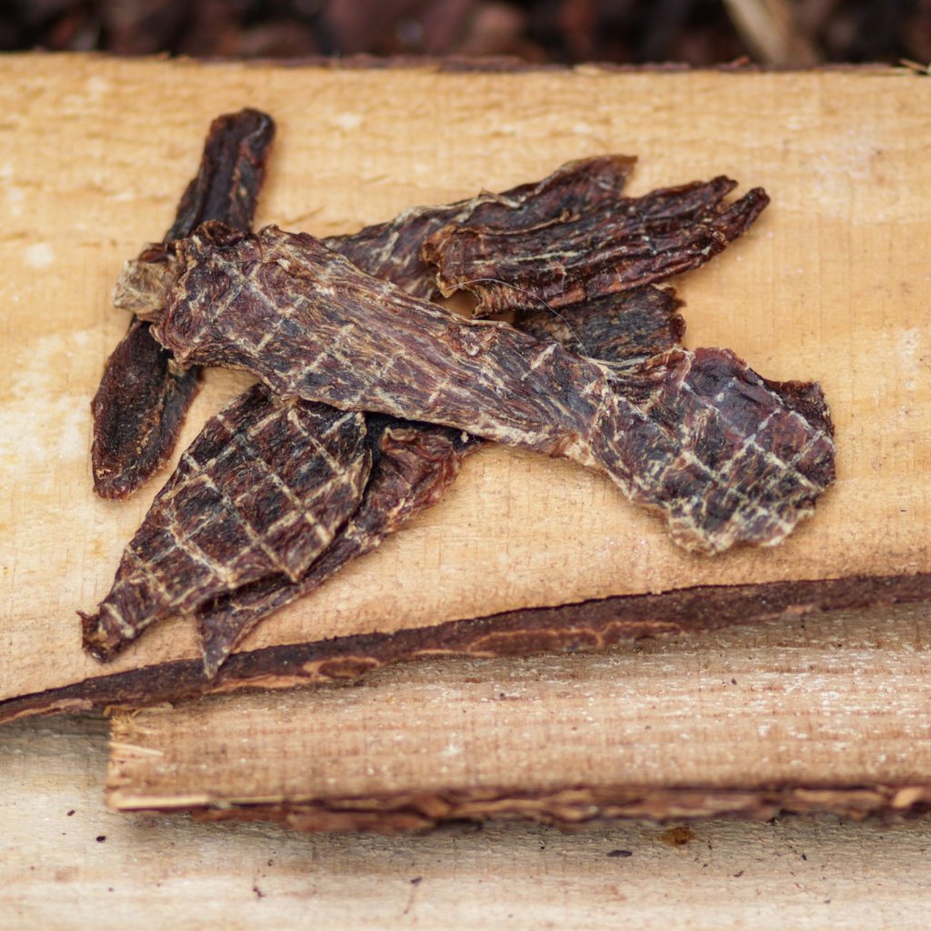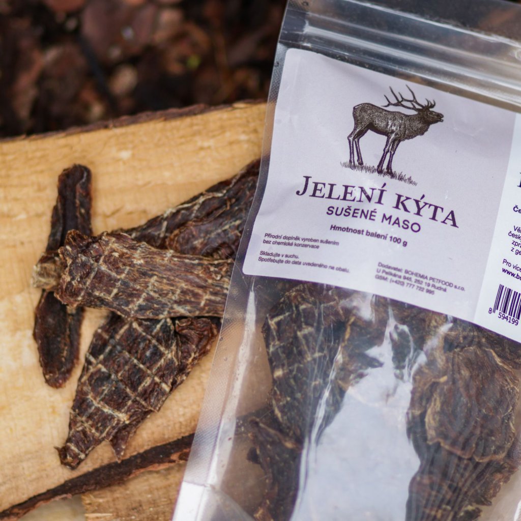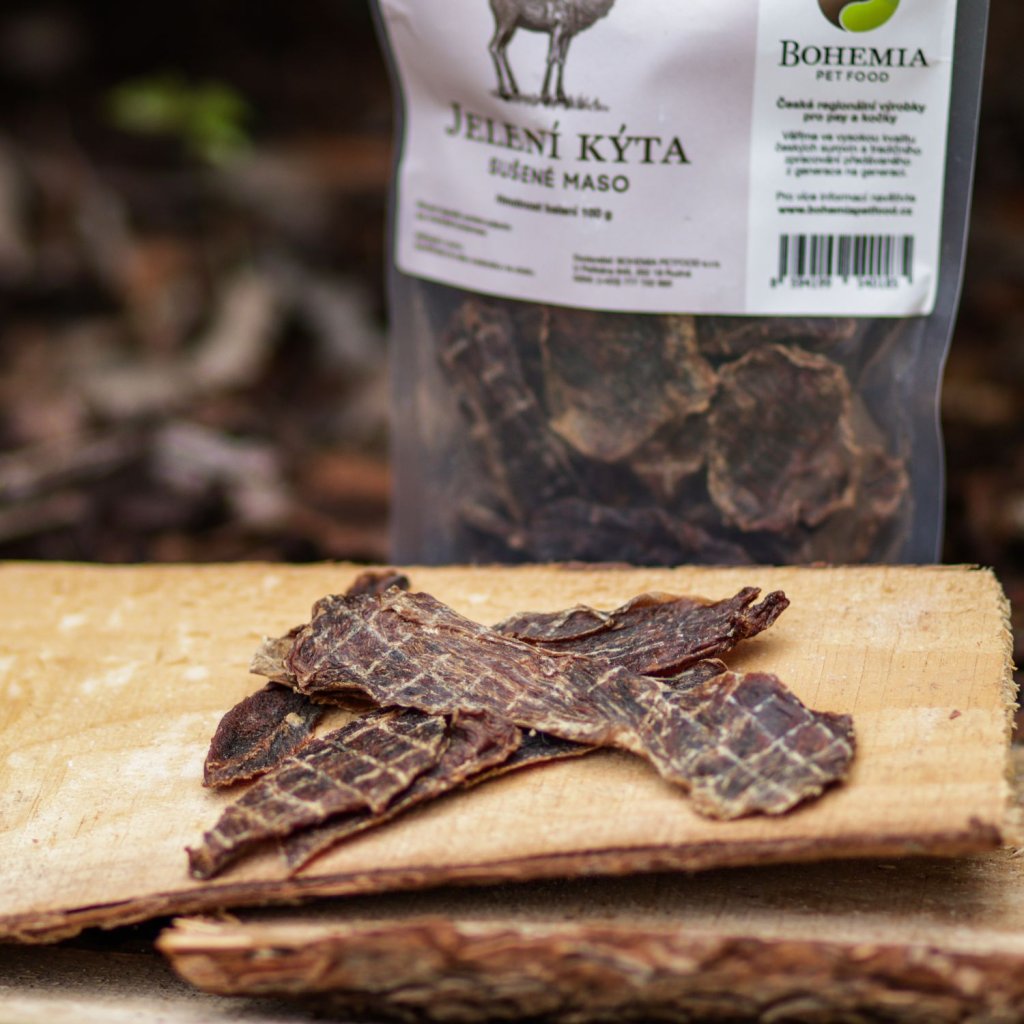 Jelení maso pochází z jižní Moravy a prochází přísnou kontrolou, která zaručí, že splňuje všechny náležitosti potřebné k zařazení do kategorie „potravinářská kvalita“. Při jeho zpracování nejsou používány žádné chemické konzervanty nebo barviva – maso se přirozeně suší vzduchem v sušárně české rodinné firmy, která dobroty pro pejsky připravuje s láskou již několik let.